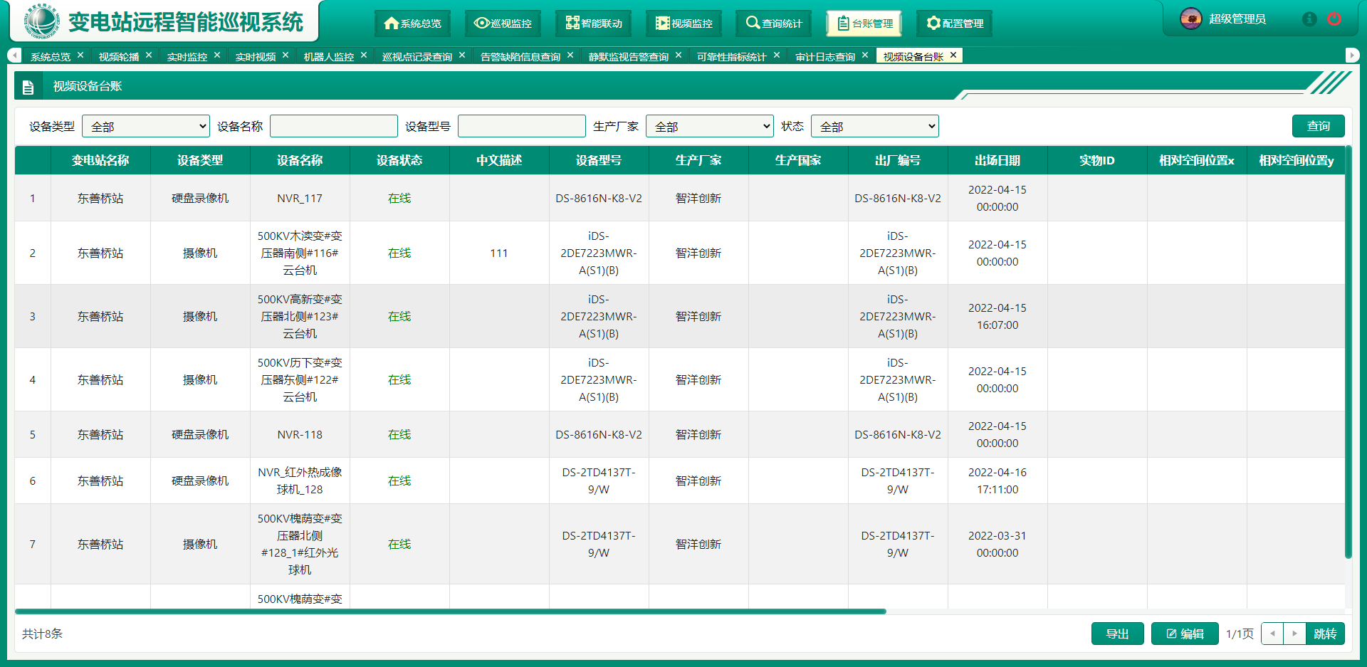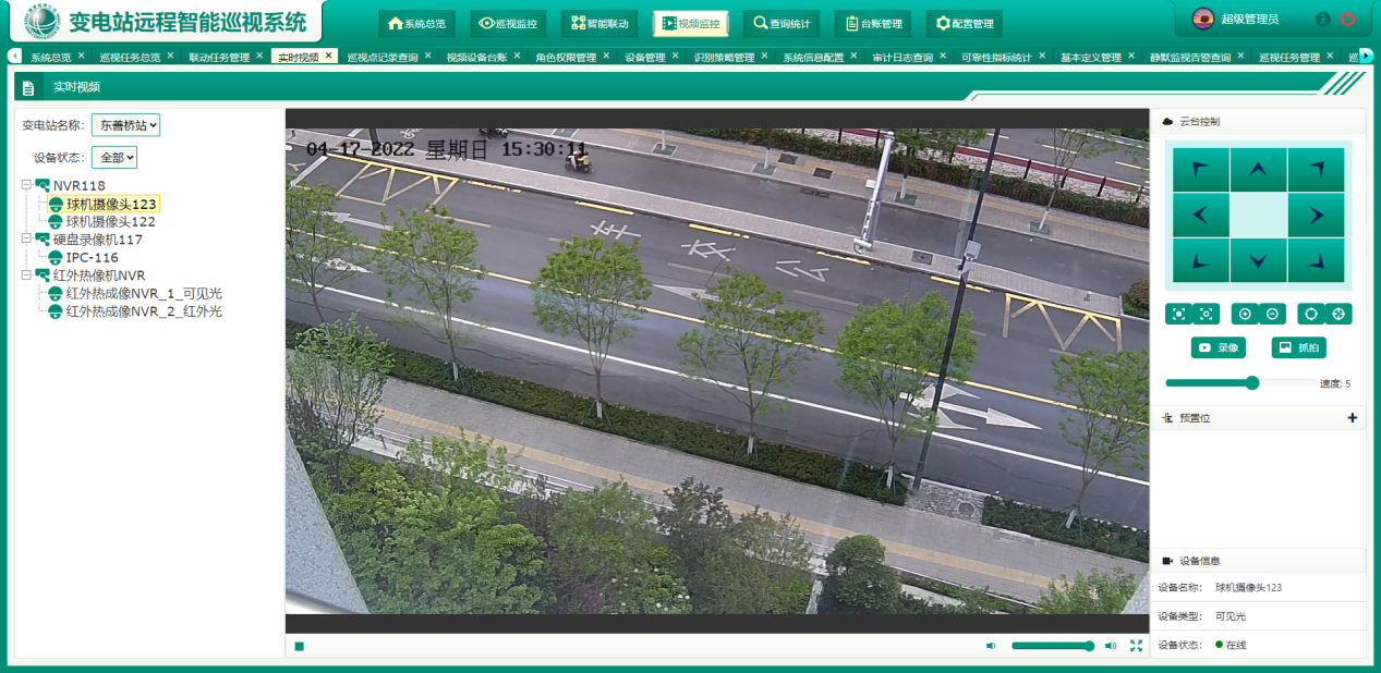 以往的视频监控主要作为安防监控应用,无法满足设备状态查看、远程巡查的运检要求。根据巡视需求对现场设备进行逐一可视化覆盖配置,实现典型的现场设备可视化点表,配置快捷操作。运维人员可对现场设备进行一键巡视,快速定位设备位置,获取实时可视化数据,提高巡视效率。