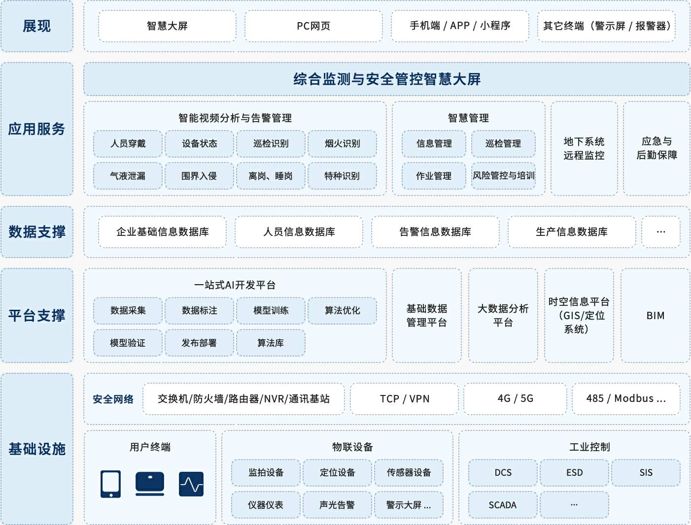 保证安全生产是智慧矿山的主要目标之一,通过提高自动化水平,用机器替代人员,减少人员安全风险,利用新一代信息技术保证精准生产,降低风险隐患的出现
